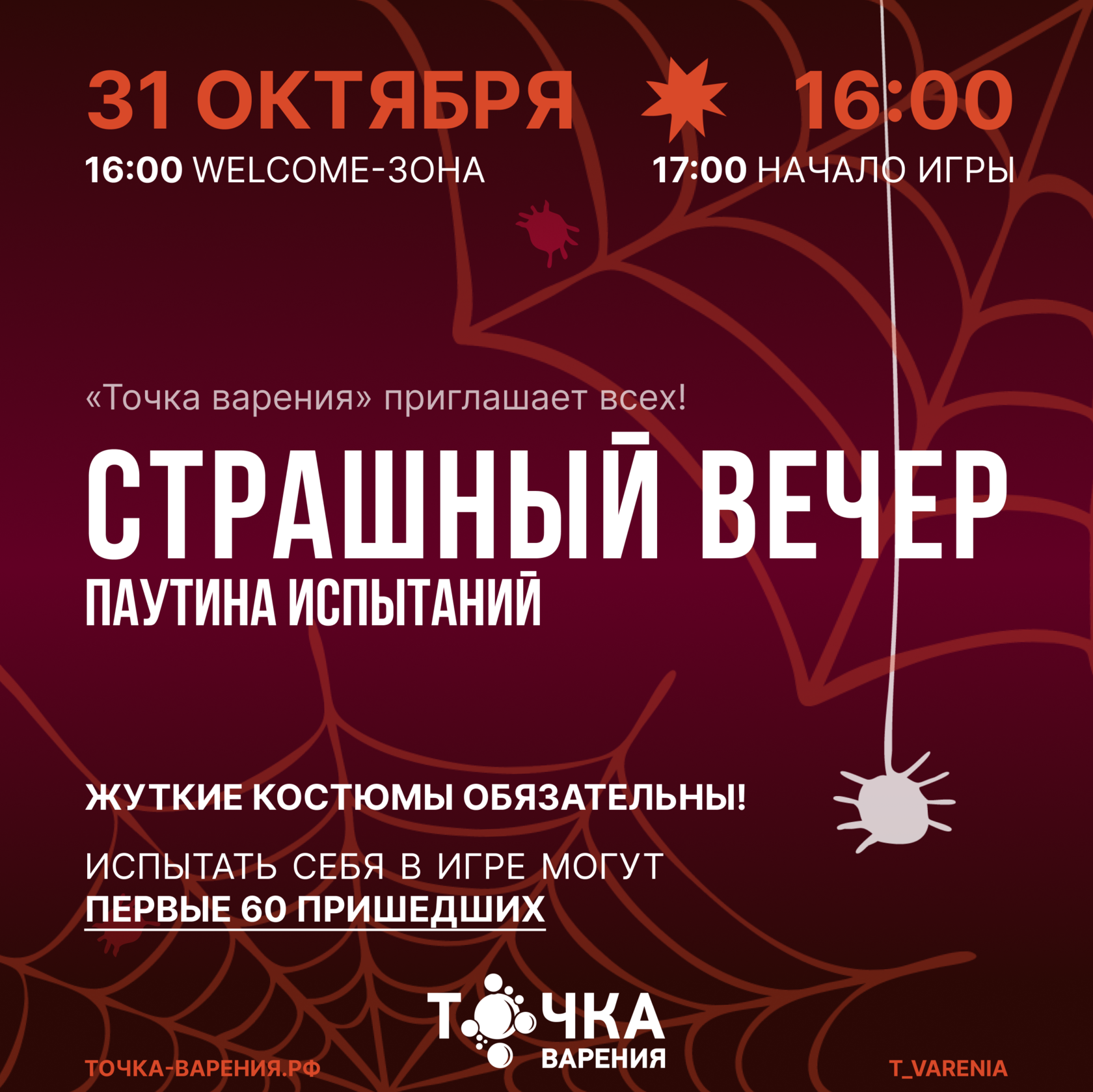 31 октября в 16.00 "Точка варения" (ул. Усачёва, д. 1, стр. 3) приглашает всех смелых ребят (7+) на Страшный вечер!